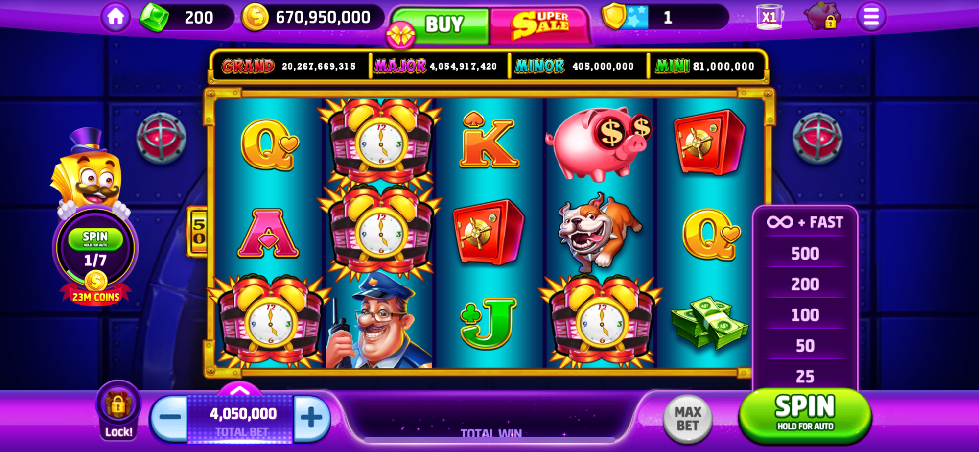 Below is an example of Jackpot Friends core gameplay. Users simply choose an amount to wager, select the “Spin” button, and then can choose automatic spins, such as 200 or 500 simultaneous spins.