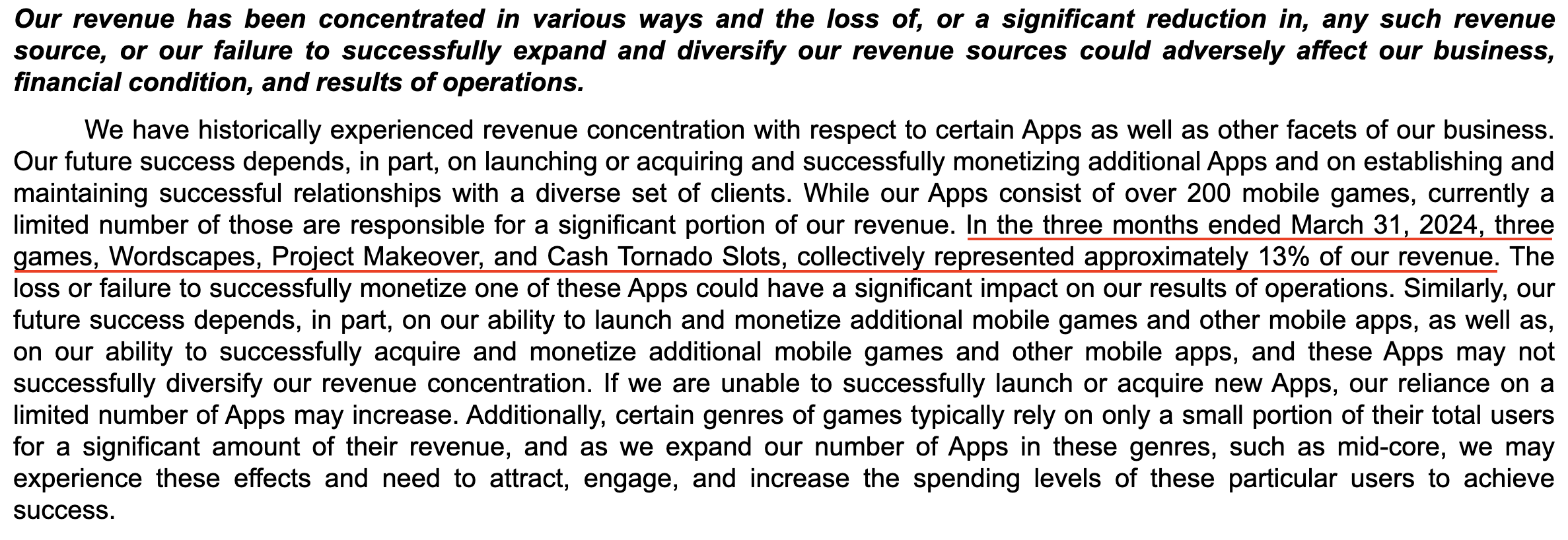 Per the 10-Q for the quarter ending March 31, 2024, “In the three months ended March 31, 2024, three games, Wordscapes, Project Makeover, and Cash Tornado Slots, collectively represented approximately 13% of our revenue.”