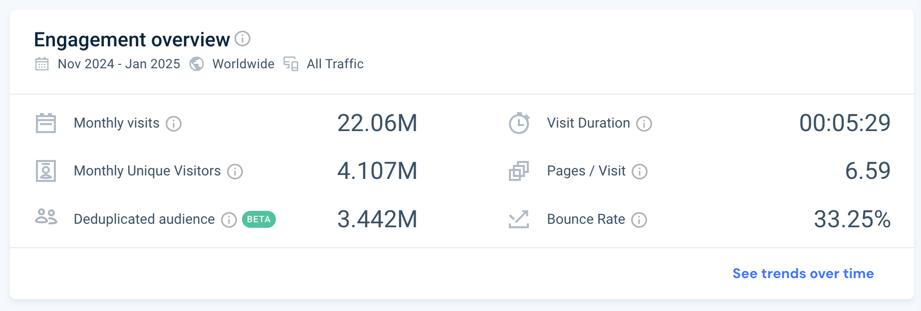 Swagbucks is no small potatoes, either. Per web traffic aggregator SimilarWeb, Swagbucks.com is the #537 most visited site in the United States for the three months of November 2024 through January 2025, with over 4M monthly unique visitors and over 22M monthly visits in this time period.