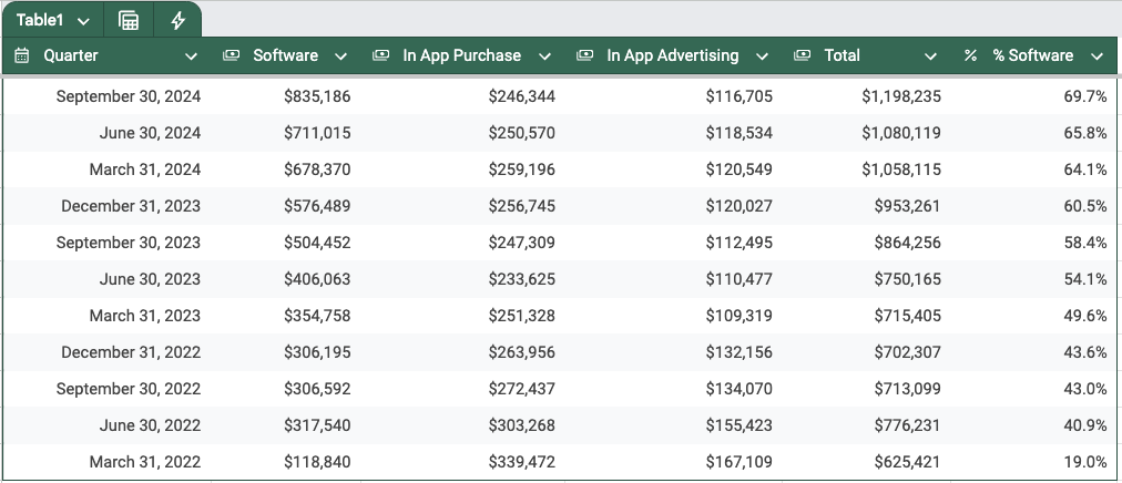 In recent quarters, AppLovin has shown they've pivoted the business from one based on revenue from their own studio games to one focused on "software platform" revenue, or revenue derived from their ad exchange business.