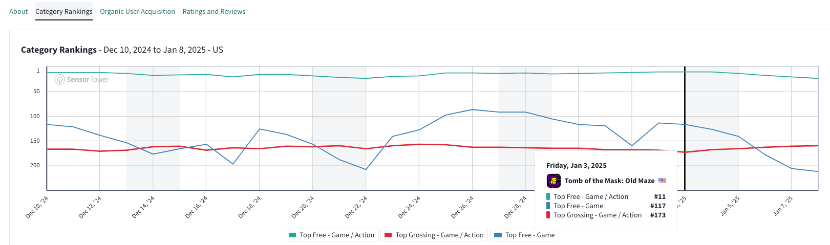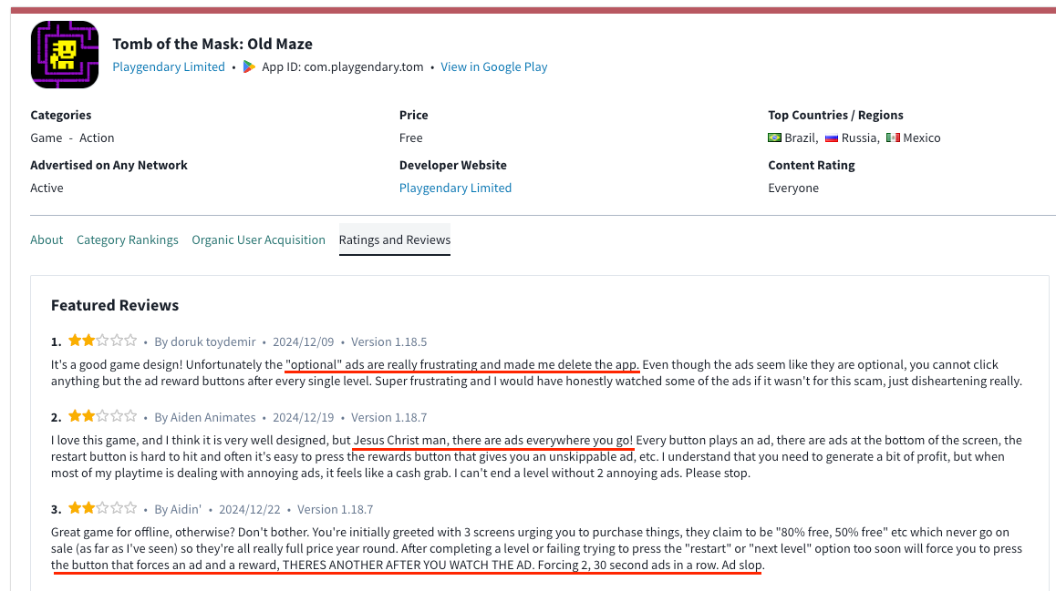 First, here is the Tomb of the Mask game from AppLovin partner Playgendary,a partner advertised above as a key partner of AppLovin. Tomb of the Mask is one of the top games per third-party SensorTower, with Tomb of the Mask even reaching #11 in free action games as recent as this past week in the US, and consistently ranking in the Top 20 free action games in the last month.