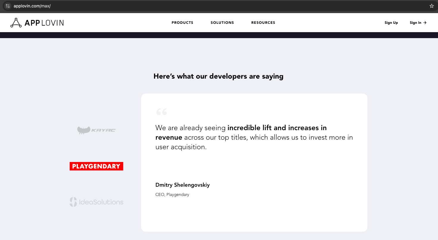 On AppLovin's MAX page, they promote KAYAC, Playgendary, and Idea Solutions as gaming studios that see the benefits of AppLovin's MAX solution.