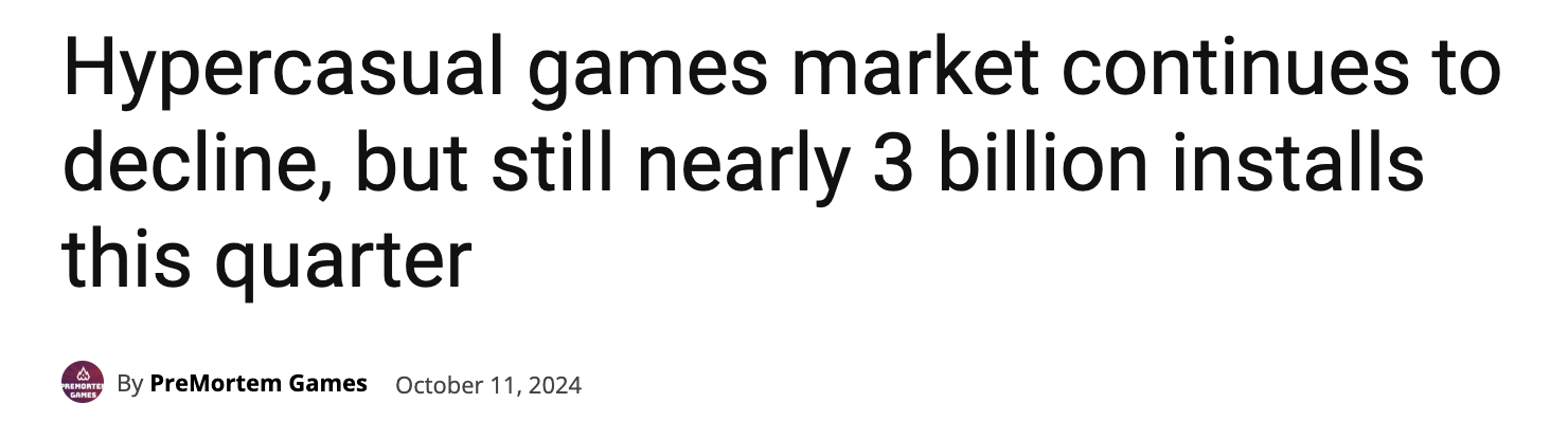 Hypercasual, if you cannot tell, is merely a pyramid scheme of studios re-skinning and re-marketing previously published games and simply throwing on a new face on existing games. This is not sustainable in the medium- to long-run.