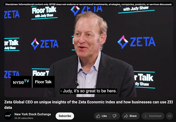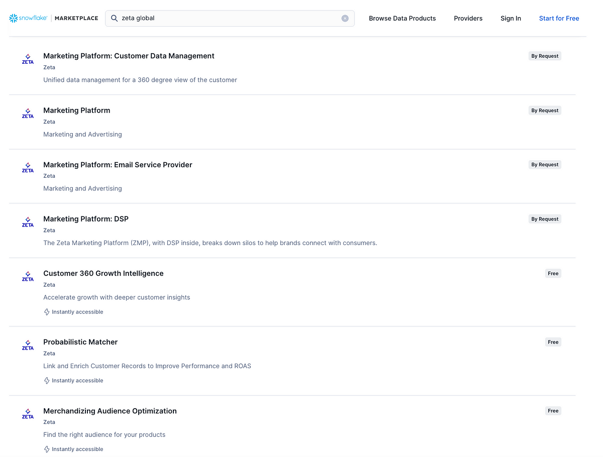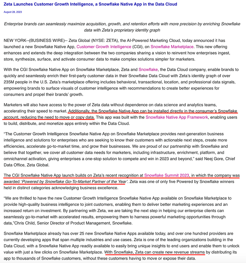 In fact, Zeta Global is one of the larger contributors to the Snowflake Marketplace, which is really just a way to offload the export of data by making customers purchase a Snowflake account.