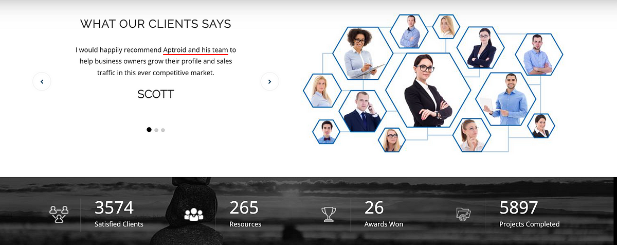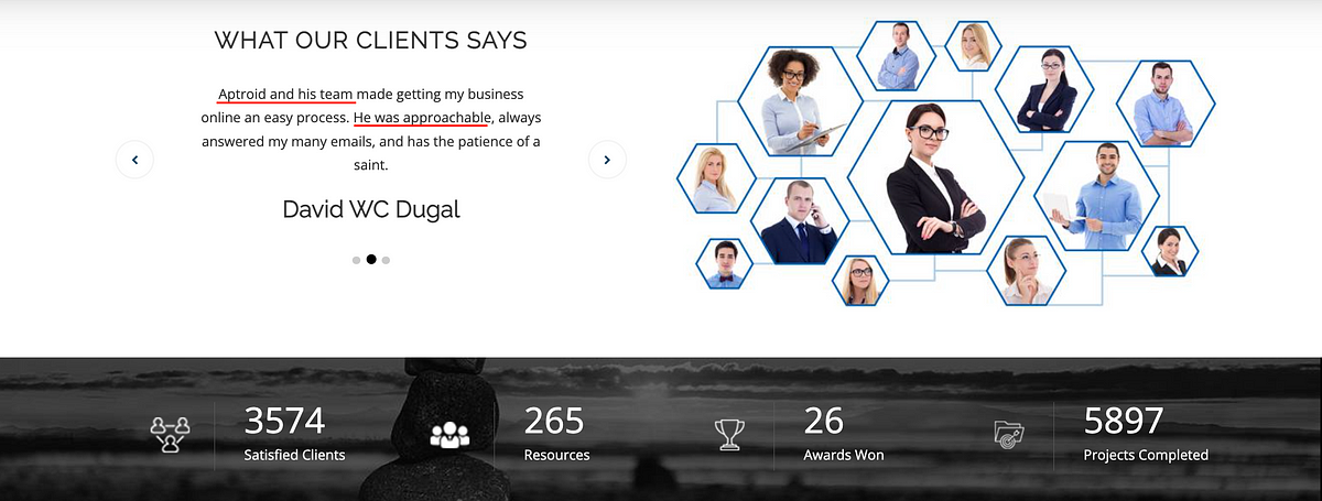 The client testimonials on Zeta’s subsidiary website are clearly fake. Aptroid is referred to not as an organization but as a person (“he” and “his”) and the testimonials are clearly cut and pasted from the website of some individual person with their name changed to “Aptroid” on Aptroid’s website.