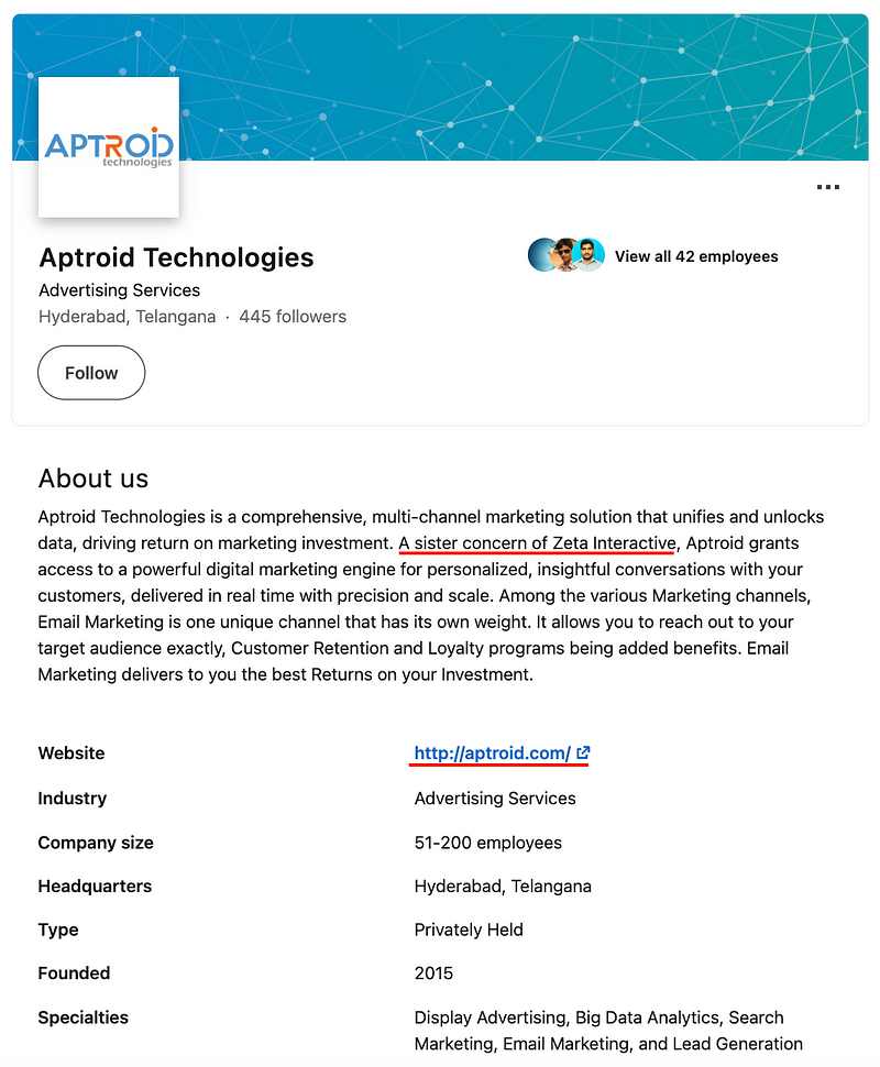 Although Zeta Global has recently redirected www.aptroid.com to Zeta Global’s website, through 2023 the subsidiary was branded as its own comically absurd marketing agency for years.